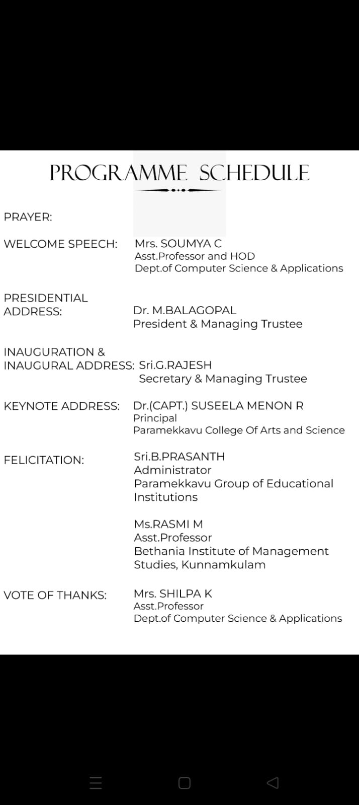 The Six-Day Faculty Development Programme (FDP) on "Next Generation Computing Paradigms" was officially inaugurated today. The event witnessed the gracious presence of the Computer Science Department faculty, esteemed management members of Sree Paramekkavu Devaswom, our respected Principal Dr Capt Suseela Menon, Administrator Sri. Prasanth Sir, and the Chief Guest of the day, Ms. Rasmi M., Assistant Professor at Bethania Institute of Management Studies.