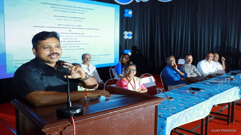 Decennial Celebrations that was held from July 21st to 29th July. The official inauguration of the Decennial celebrations was initiated by Sri Jyothis Mohan, IRS Additional Commissioner, Income Tax (TDS) & I& CI. The chief guest shared his experience and the arduous journey that he undertook while reaching this esteemed position and congratulated the efforts taken by our institution in conducting the Decennial celebrations with precision and involving social commitment. Dr. K. P Sudha, Principal, welcomed the gathering. Dr.M.Balagopal, President of Paramekkavu Devaswom, through his presidential address, highlighted the efforts & support given by various management committees and about the keen interest shown by the present committee towards the overall upliftment of the college.Sri.P.V.Nanadakumar, asst secretary of Pramekkavu Devaswom & administrator Sri Prasanth Balakrishnan presented felicitations. IQAC Coordinator Dr.Chitra P.M concluded the official inaugural session with a vote off thanks.