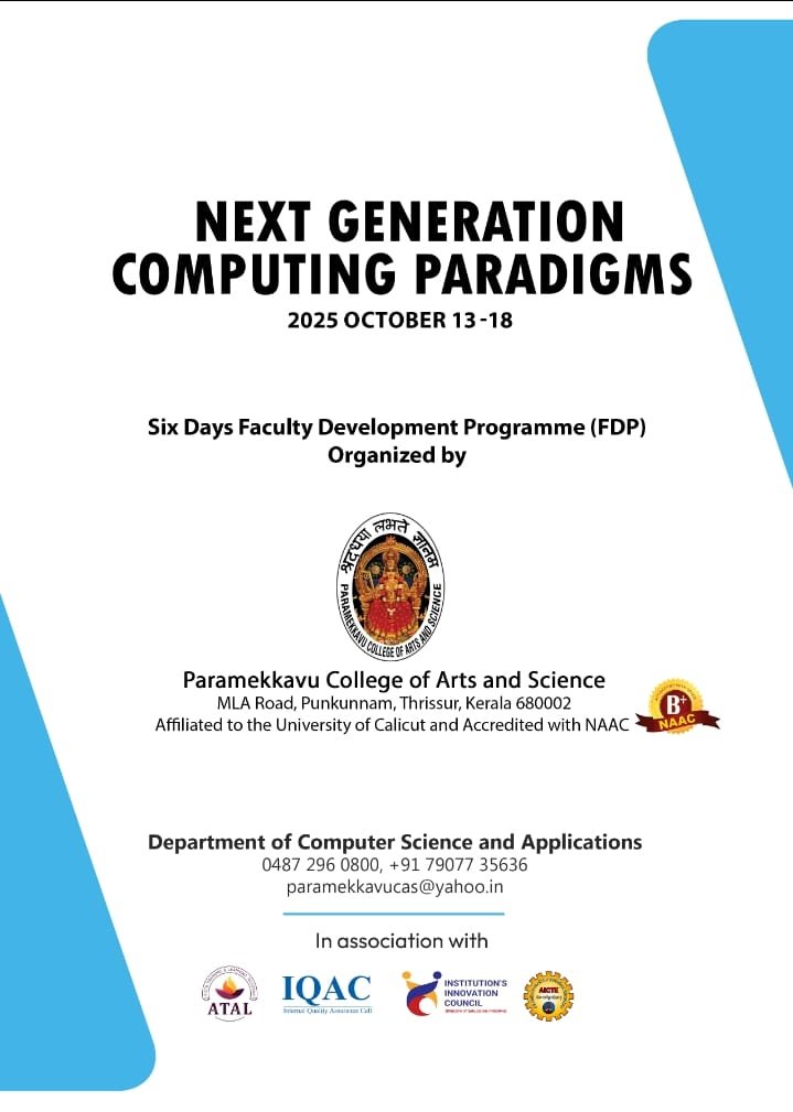 The Six-Day Faculty Development Programme (FDP) on "Next Generation Computing Paradigms" was officially inaugurated today. The event witnessed the gracious presence of the Computer Science Department faculty, esteemed management members of Sree Paramekkavu Devaswom, our respected Principal Dr Capt Suseela Menon, Administrator Sri. Prasanth Sir, and the Chief Guest of the day, Ms. Rasmi M., Assistant Professor at Bethania Institute of Management Studies.